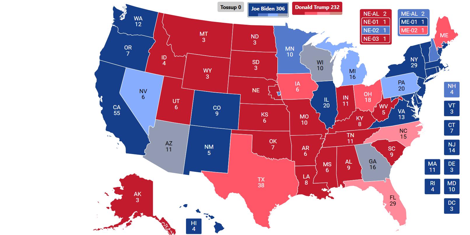 Our final forecast gives Trump a baseline of 312 electoral votes, six more than his 2016 win. This is a forecast, and in the event of a polling miss in either candidate’s favor, it could be a different end result.