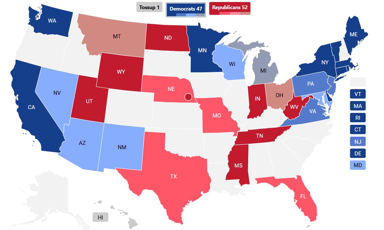 Senate which is being challenged by Independent Dan Osborn, a Navy Veteran, steamfitter, and former labor union leader. Polling shows Osborn pulling within the margin of error, but many of the polls are sponsored by him. We’re shifting this out of observation of a likely margin slip for Fischer, in addition to the fact that no Democrat is running in this race. Vote-splitting will not be a factor here, likely aiding Osborn’s candidacy. Nebraska is intensely Republican, so we think Fischer will get by, but if Osborn wins, it remains to be seen which party he would caucus with should he earn a six-year term in Washington.