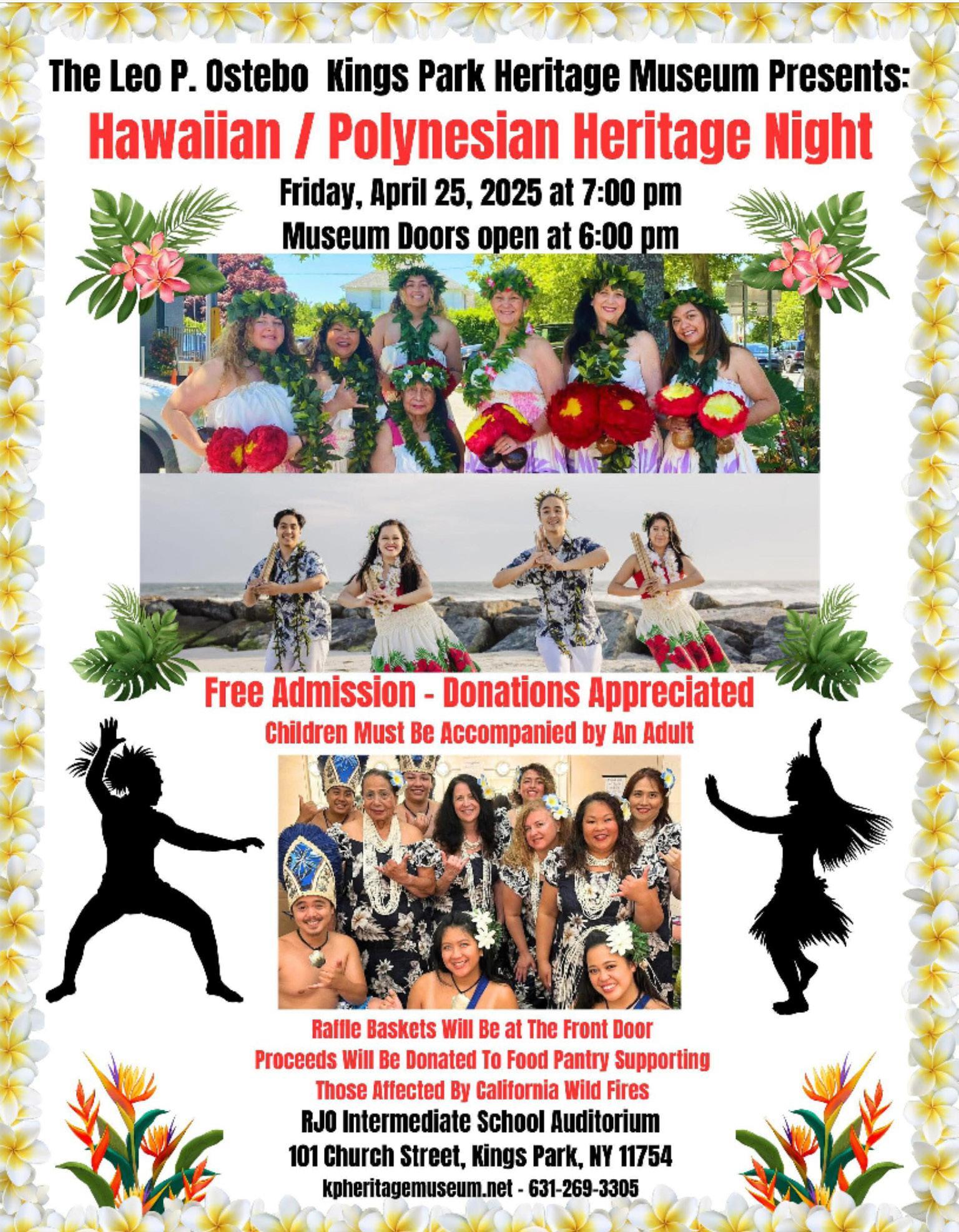 The Leo P. Ostebo Kings Park Heritage Museum continues its “Cultural Night” programming with a demonstration of Hawaiian/Polynesian culture on Friday, April 25 at 7:00p.m. at the Museum’s auditorium.