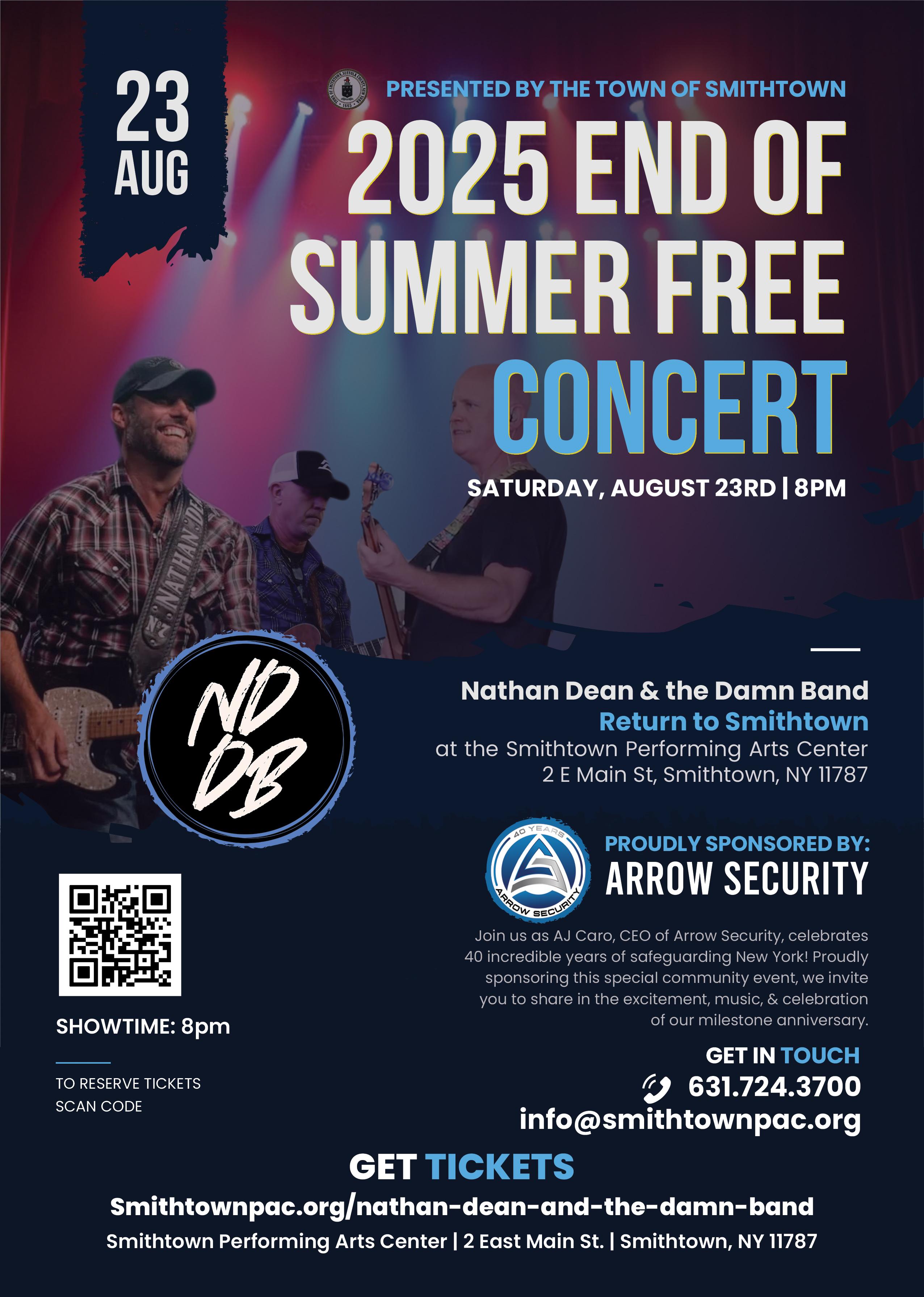 “Normally, we’d host Nathan Dean & The Damn Band outdoors for our end-of-summer celebration. But with unpredictable weekend weather all season and the incredible work happening at the Smithtown Center for Performing Arts — both in renovations and their outstanding upcoming lineup — this felt like the perfect opportunity to reintroduce our community to the Theater. Once complete, and with the Main Street revitalization project, the Smithtown PAC will serve as the anchor of our downtown. This concert is going to be the hottest ticket in town!”