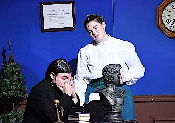 Biotech meets medieval solutions in James McLindon’s outrageous dark comedy, “Sinergy.” This one-act deals with corporate America and how it conspires to have people sell their souls to make a living. Lacey and Ayle were captivating as two cold-hearted capitalists. Uihlein, a natural-born physical comic, had the audience in stitches as the poor working-class stooge doomed to eternal damnation.