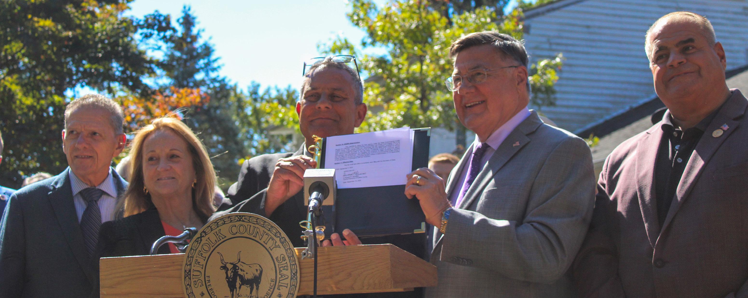 Suffolk County Executive Ed Romaine (R-Center Moriches) signed the bill into law near the North Patchogue Fire Department on Wednesday afternoon.