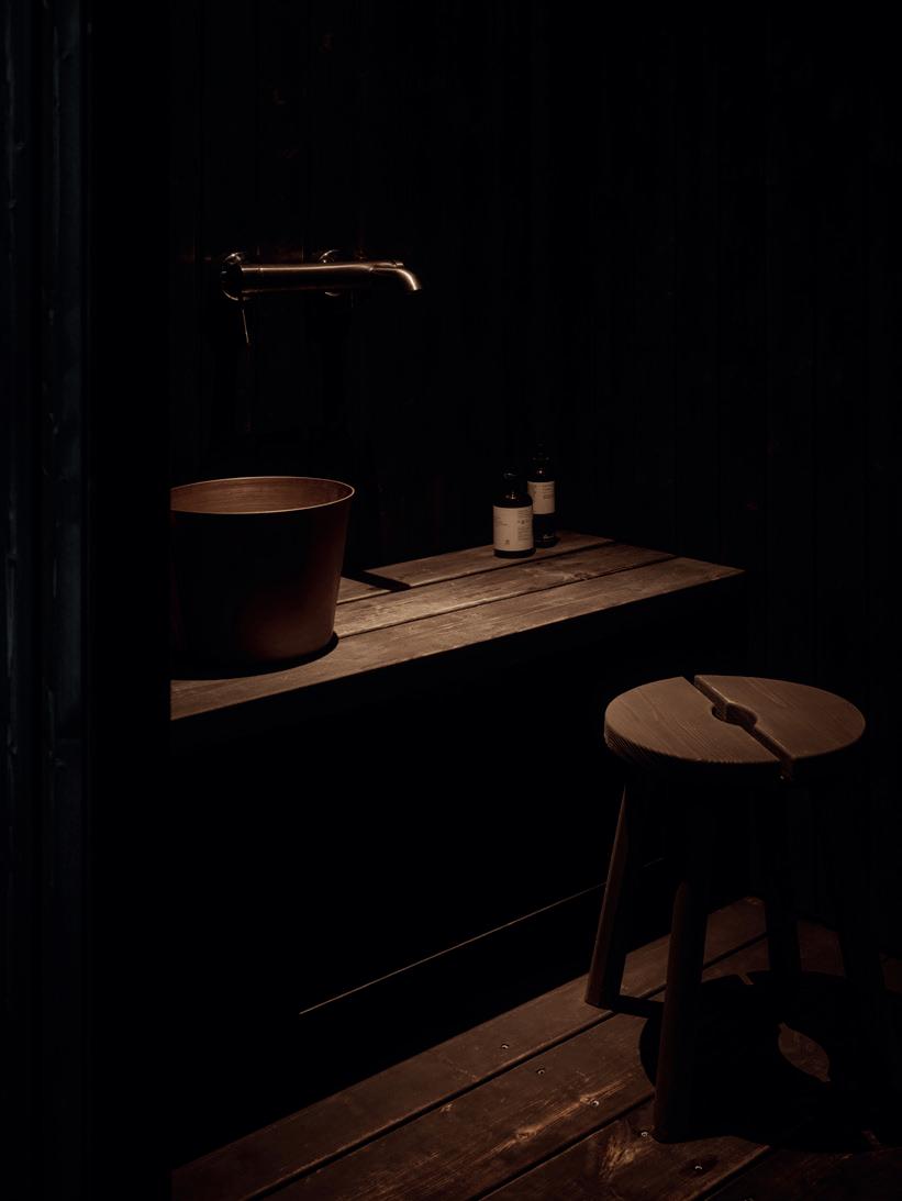 Once inside the custom sauna, Studio Puisto incorporated low, narrow windows and continued the dark, rugged material palette found throughout the pop-up, including traditional wooden slate floors, to achieve a sense of privacy and a cocoon-like feeling.