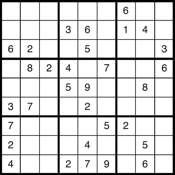 dividit en nou quadrats, omplint les cel·les buides amb un número de l’1 al 9, sense repetir cap número en una mateixa fila ni en una mateixa columna, ni dins de cada quadrat.