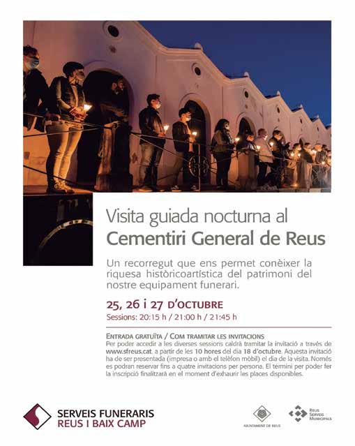 Els Serveis Funeraris de Reus i Baix Camp organitzen en guany una nova edició del cicle de visites guiades noc turnes que portaran els curi osos per diferents espais del Cementiri General de Reus. El col·lectiu La Gata Borda, sota la direcció de l’actriu reusenca Ester Cort, serà l’encarregat d’acompanyar els interessats al llarg del recorregut. En l’iti nerari establert, destaquen algunes de les sepultures i ca pelles que sobresurten per la seva riquesa artística i per la seva transcendència en la his tòria contemporània de la ciu tat. L’activitat es durà a terme entre el 25 i el 27 d’octubre. Les visites seran gratuïtes i s’efec tuaren a les 20.15 hores, a les 21 h. i a les 21.45 h. Per tal de formar-hi part, caldrà reservar entrada, a partir del 18 d’octu bre a les 10 h., a través de la pà gina web www.sfreus.cat. En el moment de realitzar el tràmit, només es podran adquirir tres invitacions per persona, que caldrà presentar el dia de la visita impreses o al mòbil. En total, es preveu que visitin les instal·lacions del cementiri 450 persones durant els tres dies que es podran dur a terme les visites guiades. L’objectiu d’aquesta iniciativa és divulgar el patrimoni viu del cementiri, que durant els darrers anys ha aconseguit un major reconei xement gràcies a la rellevància de les obres artístiques que s’hi conserven i a les accions que s’han organitzat per tal de divulgar el seu valor. Redacció