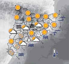Estat del cel Domini del cel serè en general, o poc ennuvolat per al gunes franges de núvols alts i prims a la meitat sud del país. Per altra banda, hi haurà núvols baixos o bancs de boira al nord de la depressió Central fins a migdia. A partir de mig matí es formaran intervals de núvols bai xos a punts del litoral i prelitoral central i sud que a par tir de la tarda podran deixar el cel mig o molt ennuvolat.
