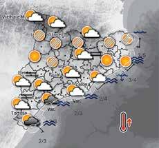 Cel serè o poc ennuvolat en general pel pas de bandes de núvols alts, i alguns de mitjans a partir de la tarda a les comarques del terç nord. A més, hi haurà alguns núvols baixos al litoral sud que al llarg del matí s’estendran a altres sectors del terç sud; al llarg de la tarda es faran més abundants i extensos per la meitat sud del litoral i al prelitoral i al final del dia afectaran altres indrets de la depressió Central.