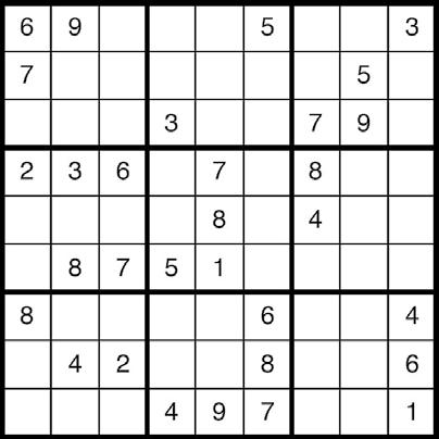 Completeu el taulell, dividit en nou quadrats, omplint les cel·les buides amb un número de l’1 al 9, sense repetir cap número en una mateixa fila ni en una mateixa columna, ni dins de cada quadrat.