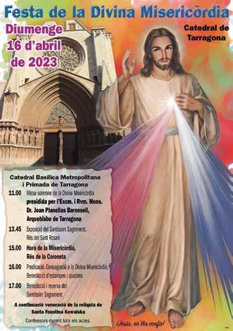 La Catedral de Tarragona acollirà el diumenge la celebració de la festa de la Divina Misericòrdia, festivitat que se celebra el diumenge posterior a la Pasqua de Resurrecció des de l’any 2000, quan va ser reconeguda per Joan Pau II. La diada, vinculada a la figura de Santa Faustina i a les aparicions que aquesta va tenir de Jesucrist, venera la figura del Crist misericordiós. De fet, i com ja s’ha fet en anys anteriors, el quadre de Jesús misericordiós es podrà venerar diumenge a l’altar major de la Catedral.