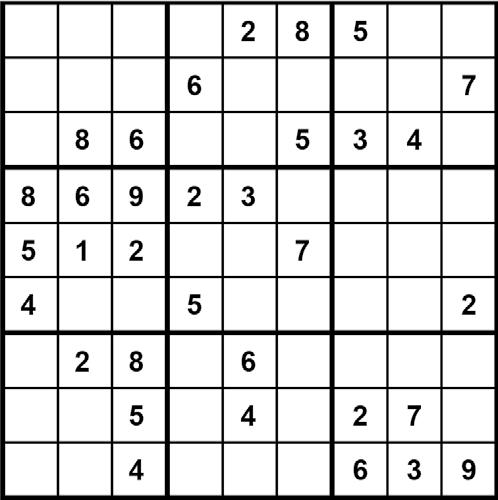 Completeu el taulell, dividit en nou quadrats, omplint les cel·les buides amb un número de l’1 al 9, sense repetir cap número en una mateixa fila ni en una mateixa columna, ni dins de cada quadrat.