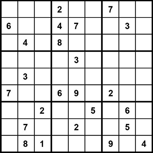 Completeu el taulell, dividit en nou quadrats, omplint les cel·les buides amb un número de l’1 al 9, sense repetir cap número en una mateixa fila ni en una mateixa columna, ni dins de cada quadrat.