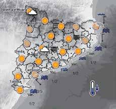 La temperatura mínima serà lleugerament més baixa, si bé el descens serà localment moderat al Pirineu. La temperatura màxima serà entre lleugerament i moderadament més alta, sobretot al litoral i prelitoral sud.