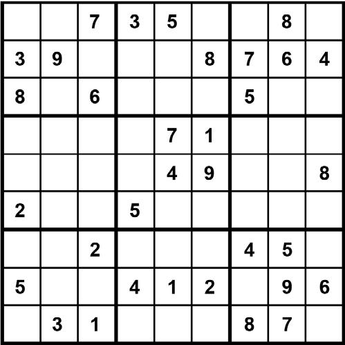 Completeu el taulell, dividit en nou quadrats, omplint les cel·les buides amb un número de l’1 al 9, sense repetir cap número en una mateixa fila ni en una mateixa columna, ni dins de cada quadrat.
