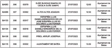 Convocar en segona convocatòria a les possibles persones propietàries dels béns i drets afectats del terme municipal de Batea a l’aixecament de les actes prèvies a l’ocupació, i si s’escau, a les actes d’ocupació en el lloc i hores que es relacionen a l’annex I, amb l’advertiment que si no compareix l’alcalde per a la seva signatura o cap altre