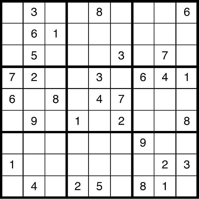 Completeu el taulell, dividit en nou quadrats, omplint les cel·les buides amb un número de l’1 al 9, sense repetir cap número en una mateixa fila ni en una mateixa columna, ni dins de cada quadrat.