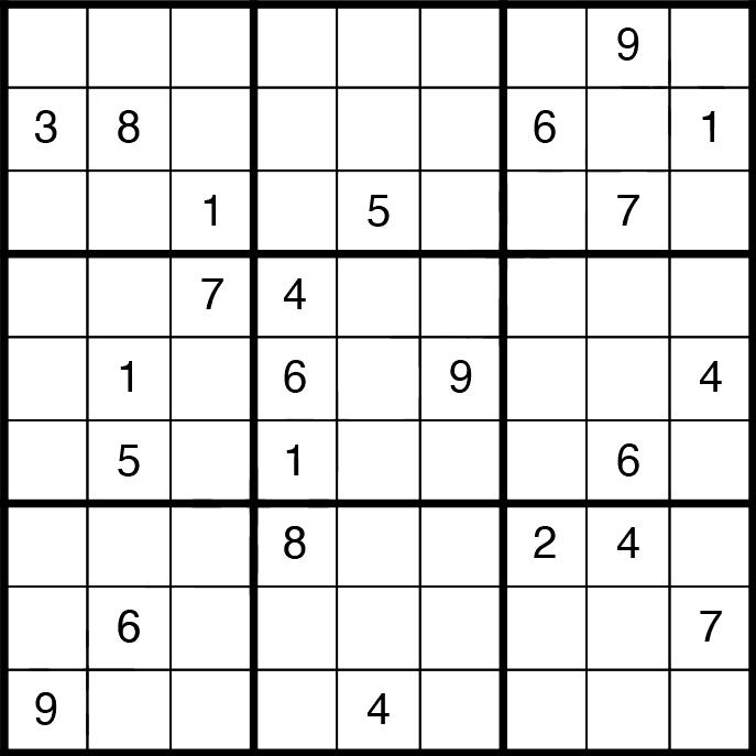 Completeu el taulell, dividit en nou quadrats, omplint les cel·les buides amb un número de l’1 al 9, sense repetir cap número en una mateixa fila ni en una mateixa columna, ni dins de cada quadrat.