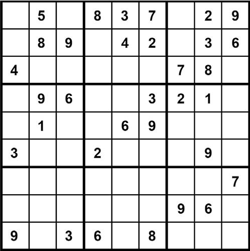 Completeu el taulell, dividit en nou quadrats, omplint les cel·les buides amb un número de l’1 al 9, sense repetir cap número en una mateixa fila ni en una mateixa columna, ni dins de cada quadrat.