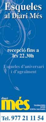 TARRAGONA Carrer Manuel de Falla, 12 Baixos 977 21 11 54 REUS Carrer Llovera, 18. 1r. 1a. 977 32 78 43 www.diarimes.com EXPOSICIÓ Av Verge Montserrat, 28 Cambrils Tel. 977 360 877 · Portes · Finestres d’alumini i PVC · Persianes · Mampares · Mosquiteres Més de 30 anys d’experiència ens avalen www.aluminismorell.com Prat de la Riba, 10. Tarragona Tel. 620 474 207 4.000€ de subvenció fins a Bene cia’t de l’ajut Europeu pel canvi de nestres Abans del 30/11/23 FINANCIACIÓ