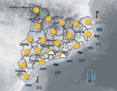 Estat del cel S’imposarà l’ambient assolellat arreu del territori, si bé fins a primeres hores del matí hi haurà alguns núvols baixos a punts del Camp de Tarragona i sud del litoral i prelitoral central. A banda, a partir de migdia hi haurà alguns núvols d’evolució a punts de muntanya. Durant la nit es formaran núvols baixos a punts del litoral sud. Temperatura