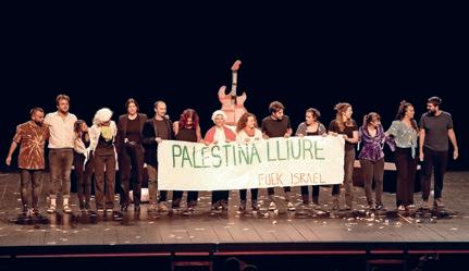 Imatge de Tornavís Teatre al final de l’actuació, amb una pancarta reivindicativa en favor del poble palestí. Carles Uriarte