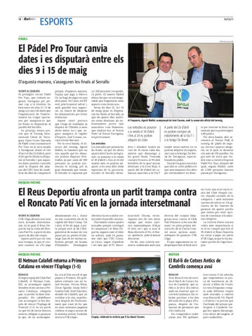 te per internet la final, una emissió que es podrà seguir a 80 països. Per altra banda, ahir arrencava al Tennis Park el torneig de pàdel de segona, tercera i quarta categoria, en el qual es donaran cita més de 150 parelles. Un gra més de sorra que tindrà com a cirereta l’esperat Pádel Pro Tour, després del qual, segons Mallol, «més de 2.500 persones hauran passat per Tarragona».