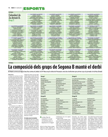 A menys de vint dies de la fins ara teòrica data d’inici de competició a la Segona Divisió B, la Reial Federació Espanyola de Futbol (RFEF) va desvetllar ahir tant la composició dels grups com el calendari de lliga a la categoria de bronze. La nova distribució manté el derbi de la demarcació, que creuarà Nàstic i CF Reus per primer cop a la catorzena jornada, el 17 de novembre a territori tarragoní. La distribució final dibuixa un grup III en què tenen cabuda deu conjunts catalans, vuit valencians i dos de les illes, i recupera el Lleida Esportiu, que torna després de competir la passada campanya al grup II. Tot plegat començarà, com s’esperava inicialment, el proper 25 d’agost. La resolució de la RFEF depara un inici complicat per als homes de Castillejo i Vicente que jugaran aquesta temporada coincidint alhora en les cites a casa i en els desplaçaments. El primer escoll dels grana serà el recuperat Lleida Esportiu, al Nou Estadi, i el Nàstic viurà el primer encontre lluny del seu feu davant el Prat. En els successius compromisos, el conjunt tarragoní es veurà les cares amb Espanyol B, Sant Andreu i L’Hospitalet, fins assolir la cinquena jornada de competició. El CF Reus, per la seva banda, s’estrenarà contra l’Huracan Valencia a l’Estadi, i