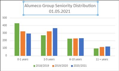 ⬧ The development of the seniority distribution shows an increasing degree of retainment of competences and experience - indicating that the Alumeco Group succeeds in integrating new employees and in offering relevant and adequate personal development.