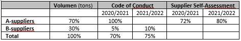 We have established a Corporate Governance System embracing specific policies and principles to ensure the highest ethical standards within our own corporation and our business partner’s. The past year we have once again increased the share of our purchase measured on volume and which is subject to our Supplier Code of Conduct, thus the share now amounts to 70%.