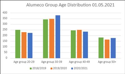 ⬧ The age distribution is stable and indicates that the Alumeco Group’s initiatives concerning working environment and personal development meet the employees regardless of age