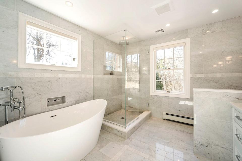 Marble spa bath has a deep soaking tub, shower, double vanity, and a built in waterproof monitor/tv