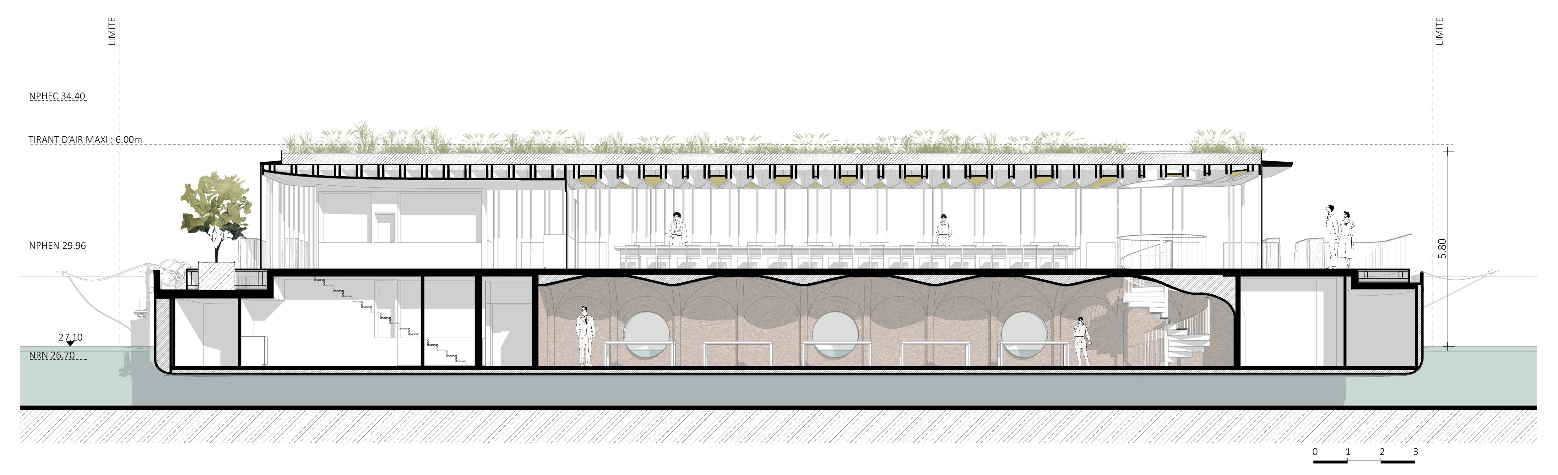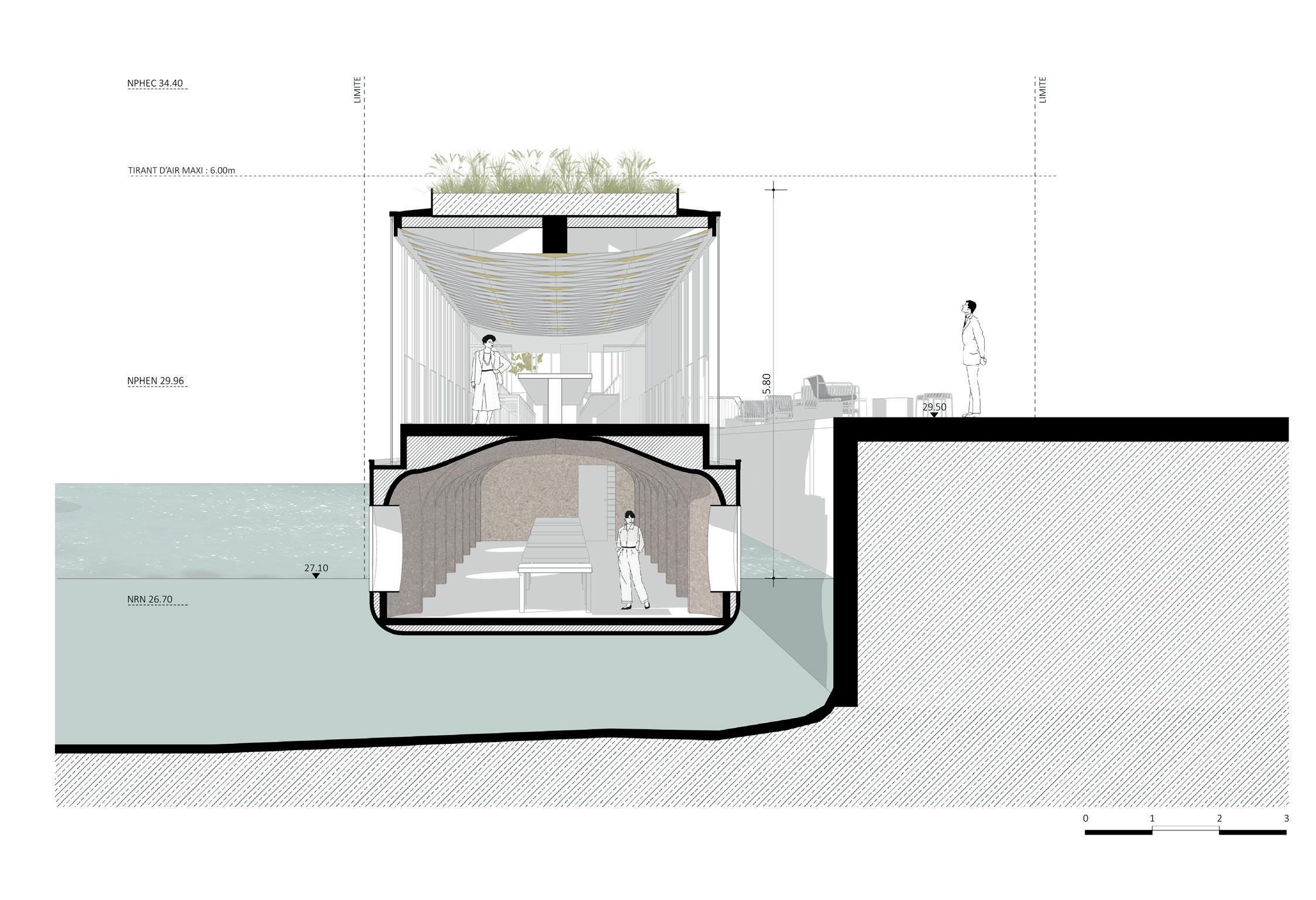 This competition submission is for Paris’s “Re-inventing the Seine” initiative. It presents a redesign of an existing barge, transforming it into a venue for community and cultural activities. The design integrates fluid spatial geometries with contextual references to the Seine and Notre Dame Cathedral, reflecting heritage and modernity. Key design strategies include suspending horizontal planes and incorporating biodiversity to create an immersive experience.