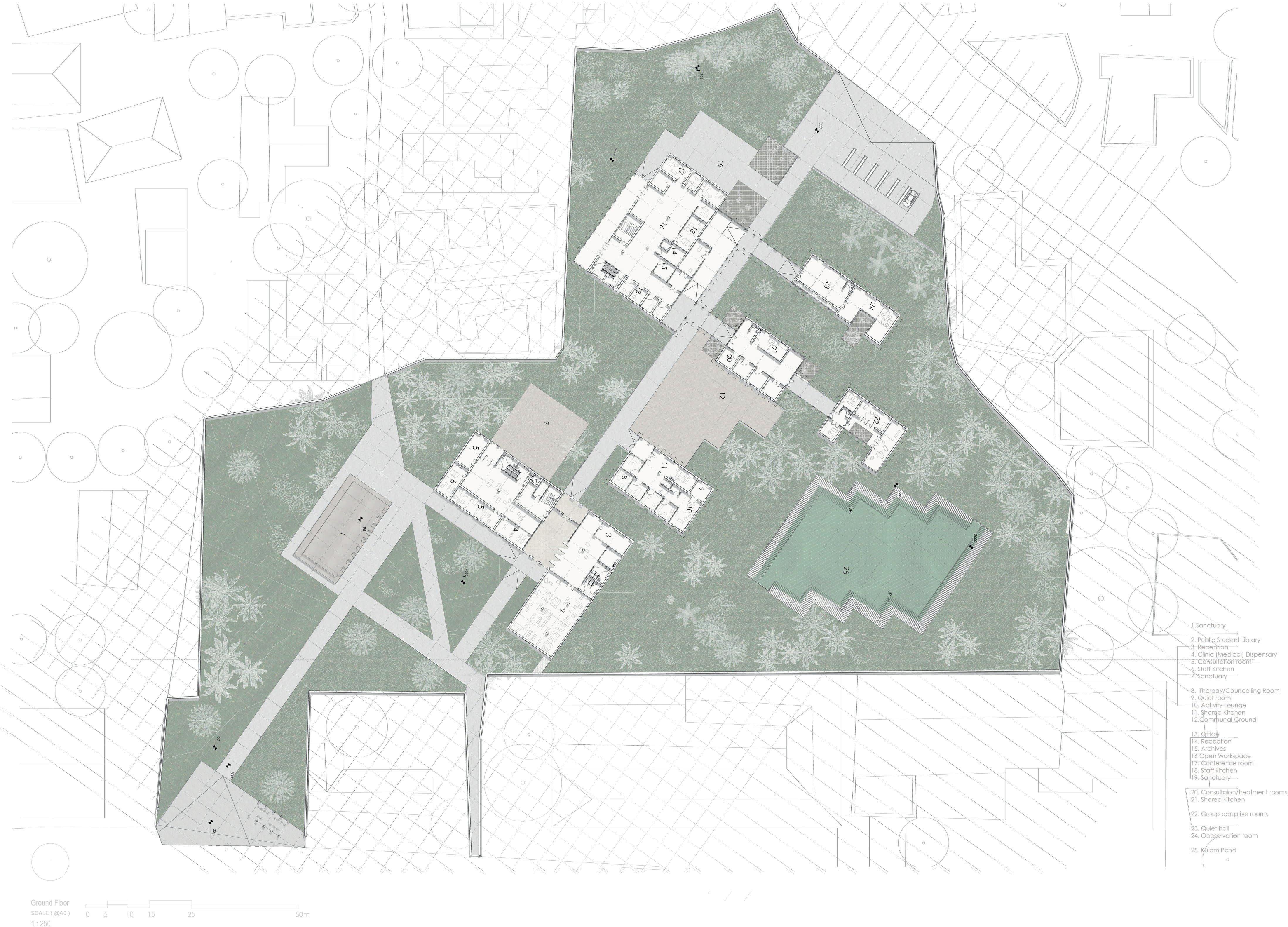 This project aims to address mental health stigma through urban design interventions by establishing a community recovery care centre in Calicut. The strategy integrates access to green spaces, recreational areas, and community-orientated facilities to promote well-being. By reimagining the existing urban fabric, the design emphasises inclusivity and the power of spatial interventions in fostering mental health.