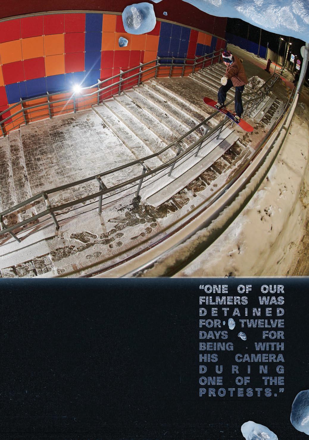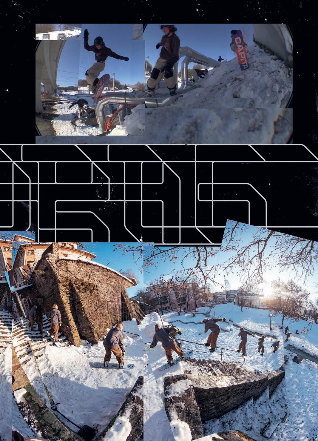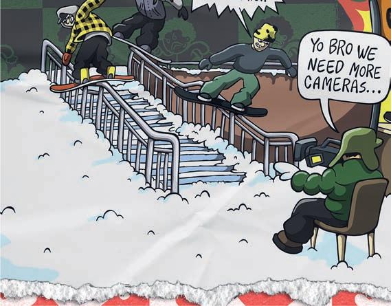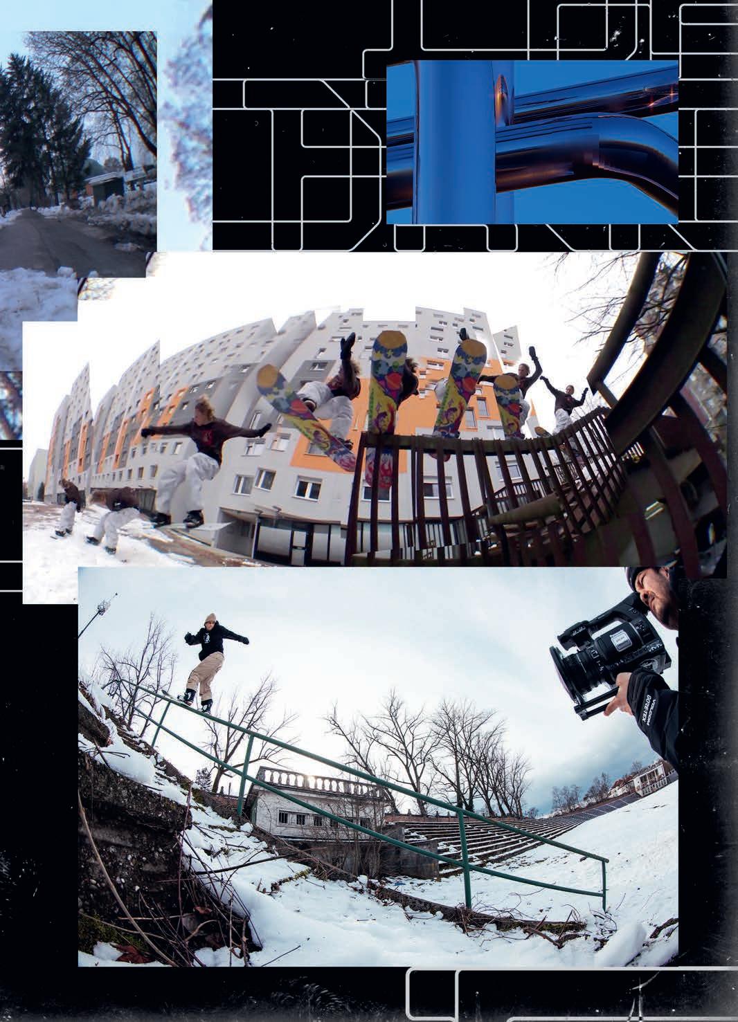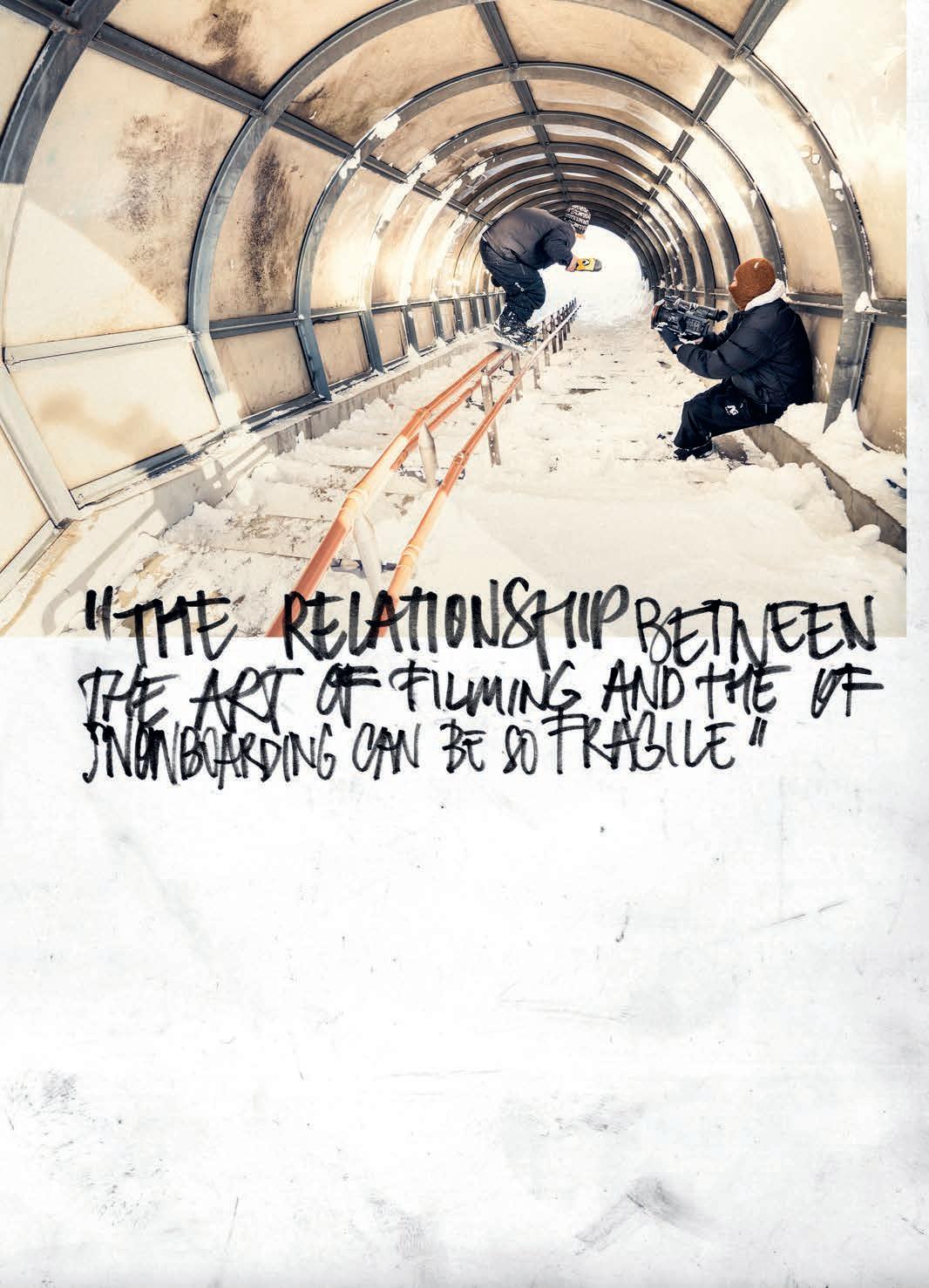 experience of lming looks pretty mellow and somewhat healthy. But then the outcomes of the videos are rather violent. What’s up with that ? I want things to be that way, personally. There’s a whole lot of really bright and sunny stu out there right now, and I really like the edgy shit, so that’s cool. I feel like a lot of these snowboard movies are missing something. You have all these lm angles of people’s faces, but you don’t see them laughing, and they’re acting with each other. There’s no personality and style to a lot of this shit. We want to have this edgy, sort of violent, scary look but with that sarcastic comedy with it, too.