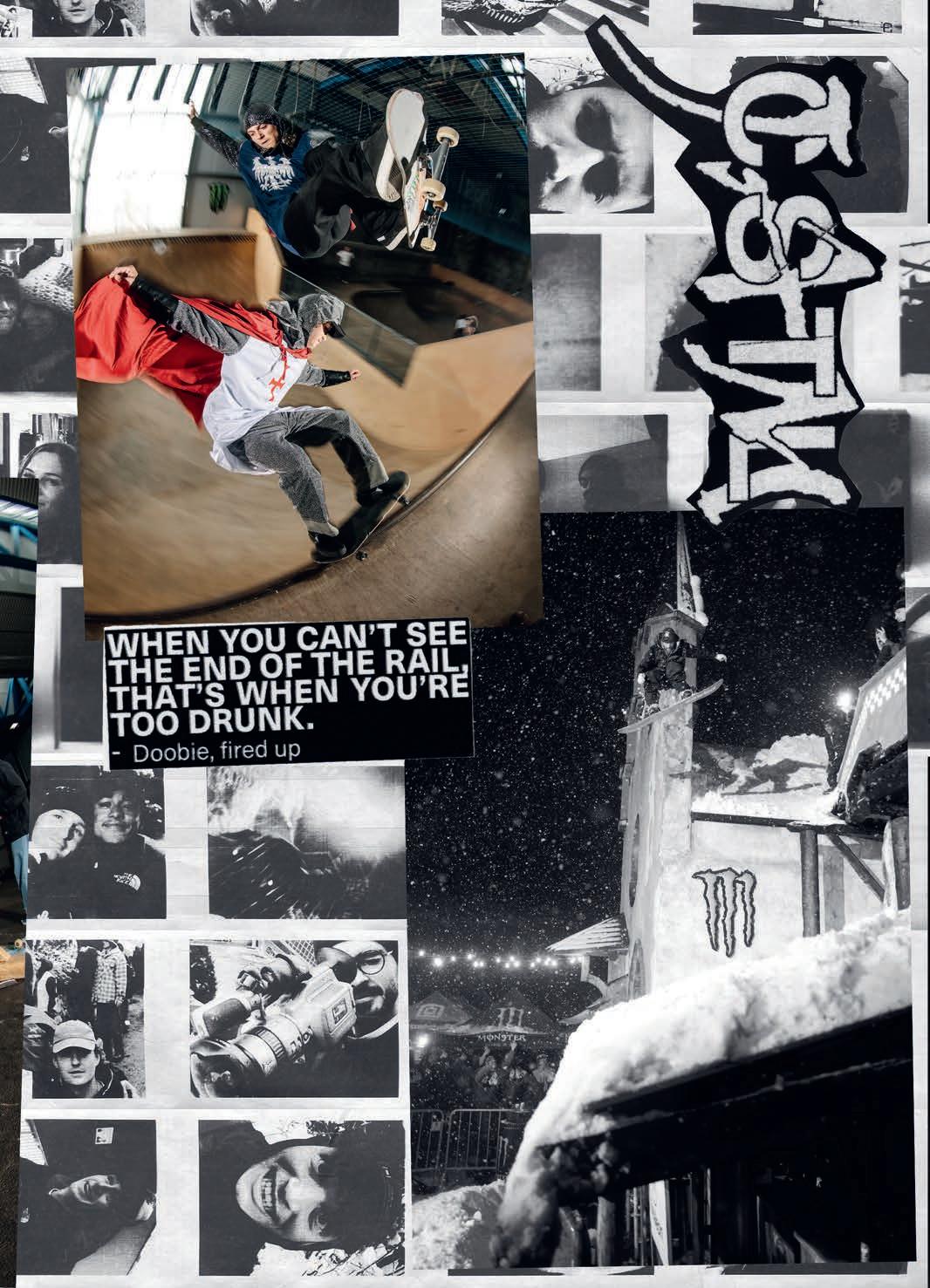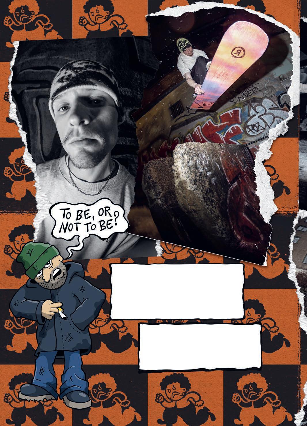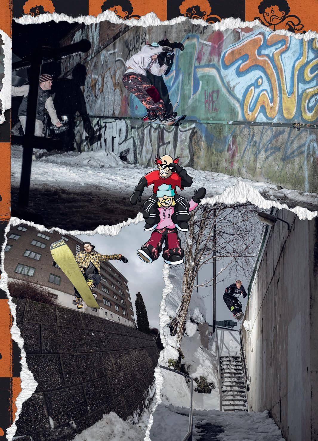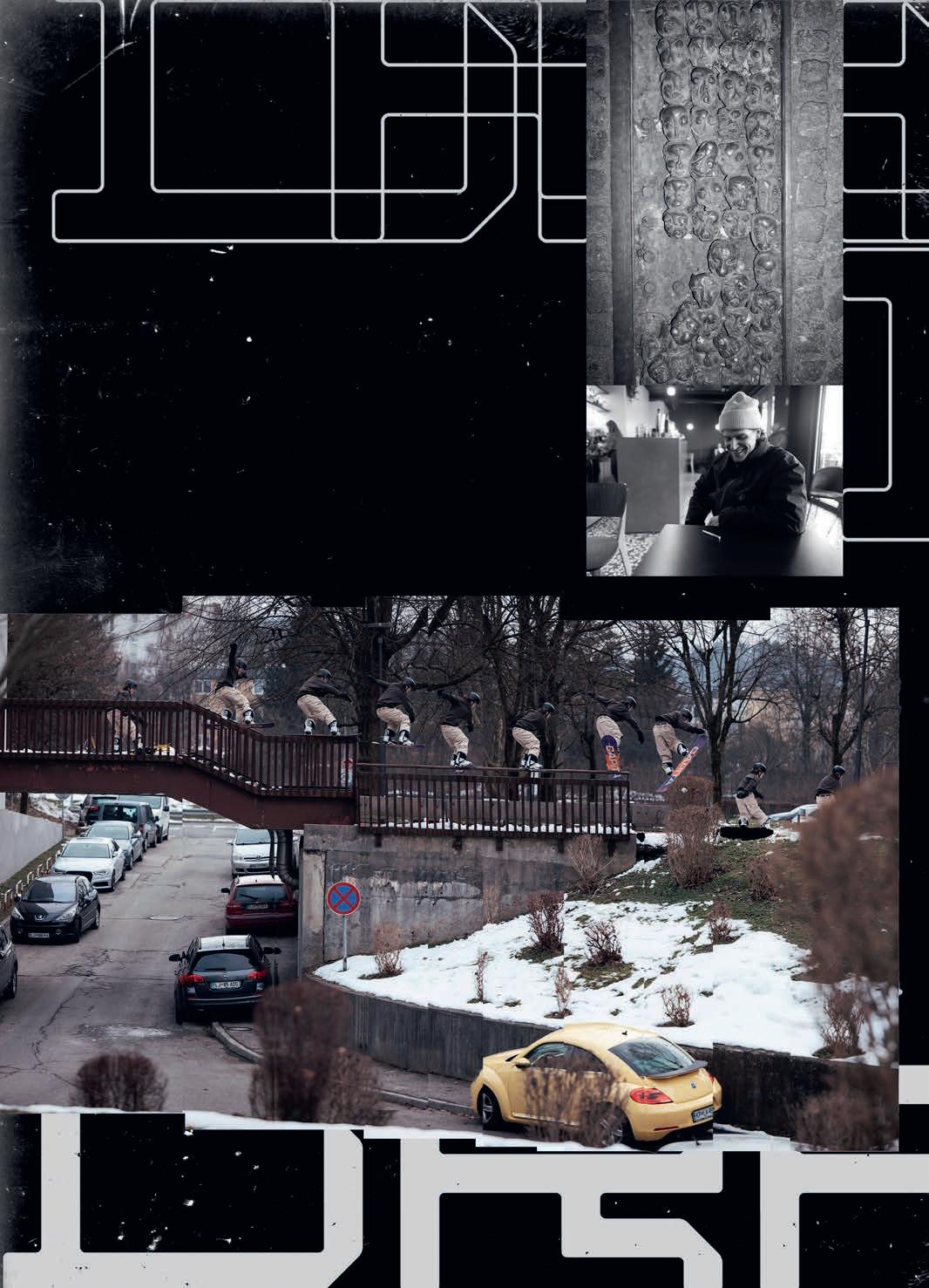 experience of lming looks pretty mellow and somewhat healthy. But then the outcomes of the videos are rather violent. What’s up with that ? I want things to be that way, personally. There’s a whole lot of really bright and sunny stu out there right now, and I really like the edgy shit, so that’s cool. I feel like a lot of these snowboard movies are missing something. You have all these lm angles of people’s faces, but you don’t see them laughing, and they’re acting with each other. There’s no personality and style to a lot of this shit. We want to have this edgy, sort of violent, scary look but with that sarcastic comedy with it, too.