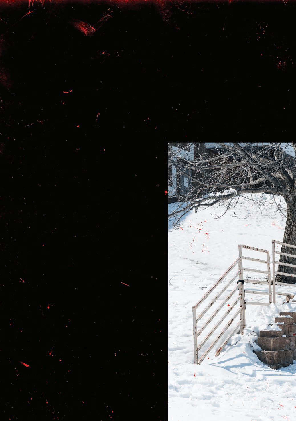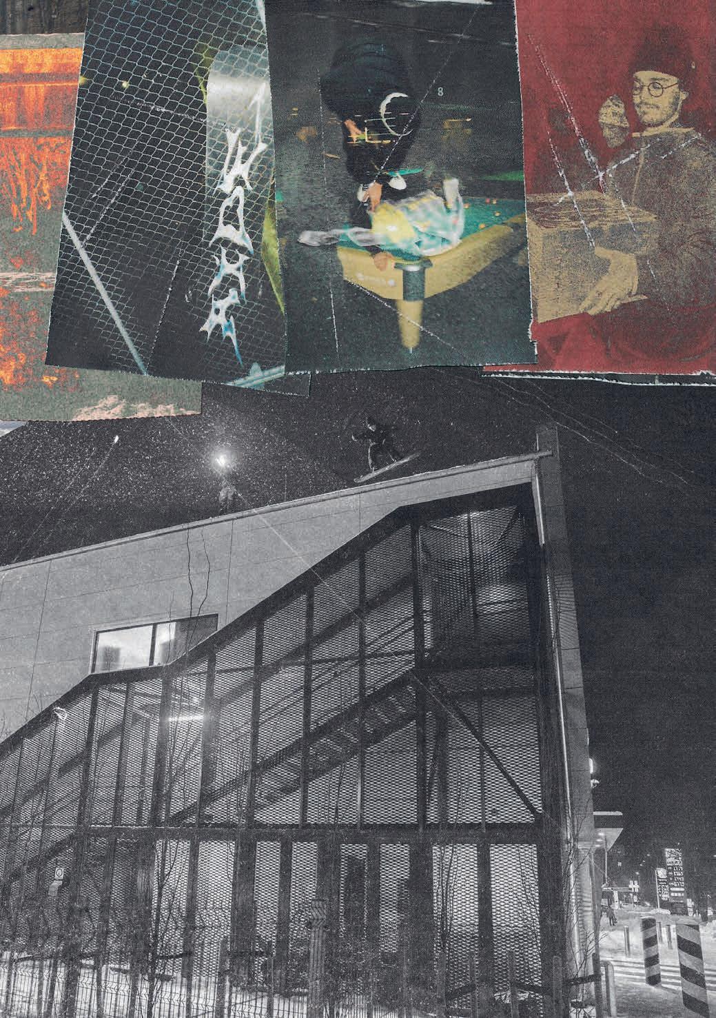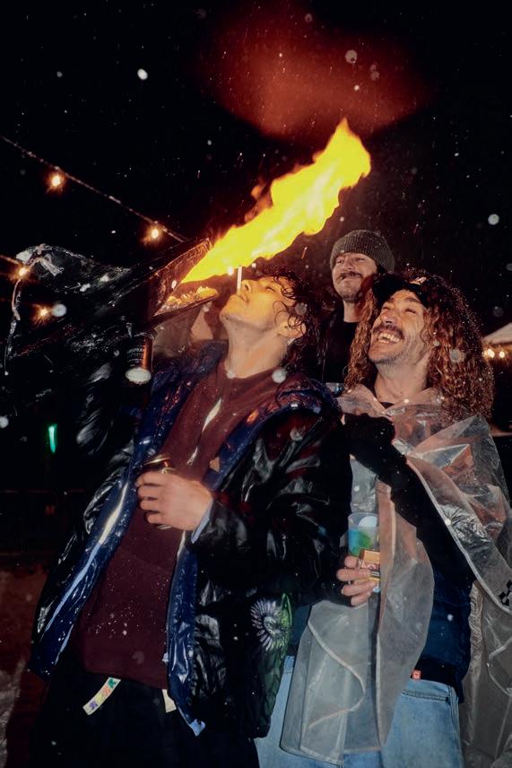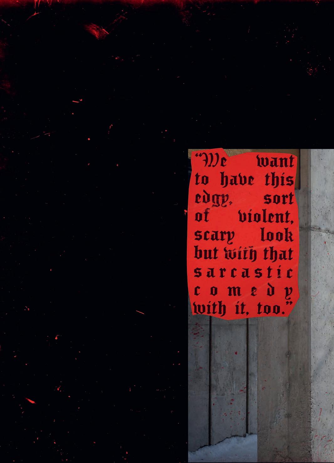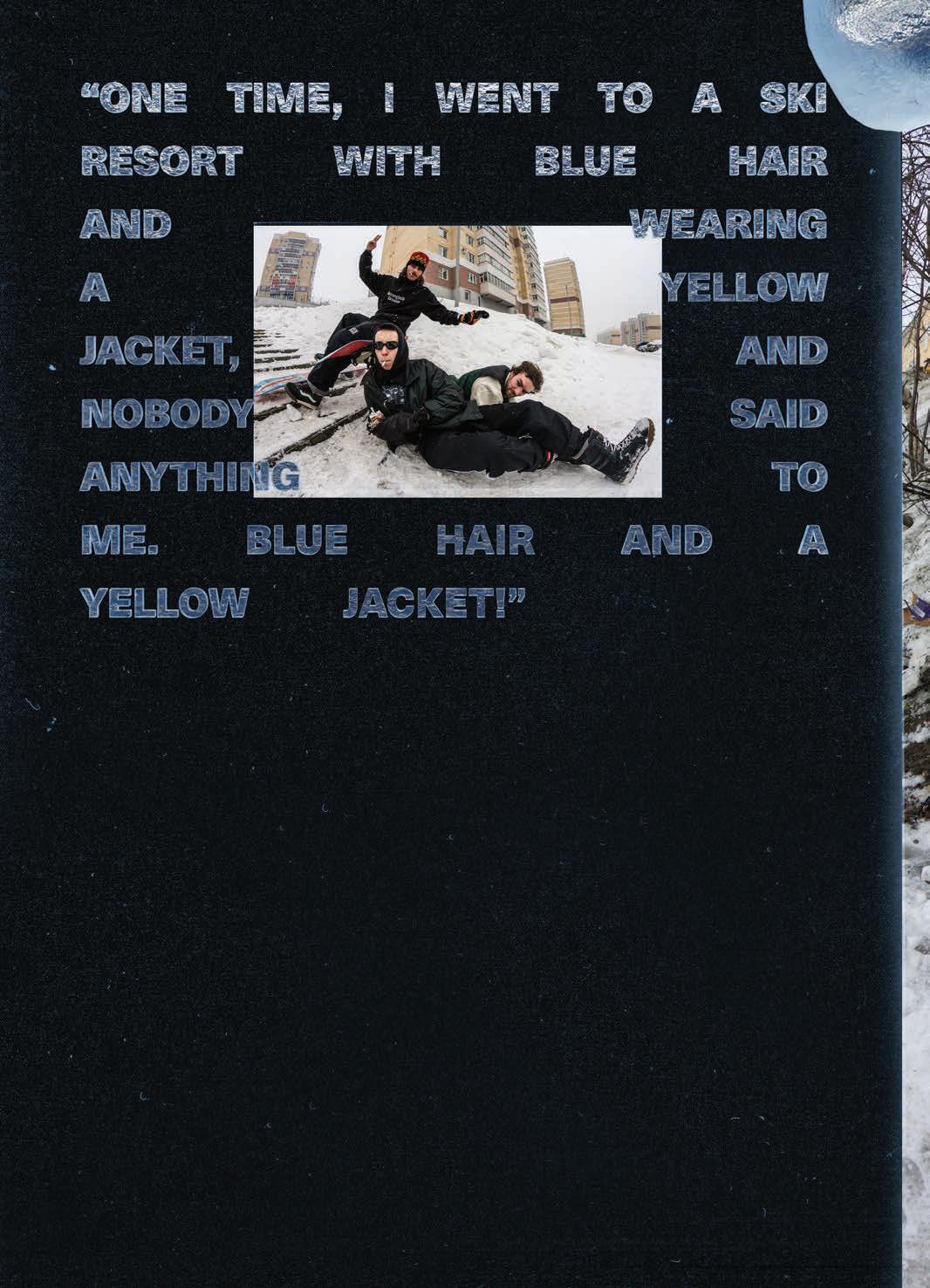 experience of lming looks pretty mellow and somewhat healthy. But then the outcomes of the videos are rather violent. What’s up with that ? I want things to be that way, personally. There’s a whole lot of really bright and sunny stu out there right now, and I really like the edgy shit, so that’s cool. I feel like a lot of these snowboard movies are missing something. You have all these lm angles of people’s faces, but you don’t see them laughing, and they’re acting with each other. There’s no personality and style to a lot of this shit. We want to have this edgy, sort of violent, scary look but with that sarcastic comedy with it, too.
