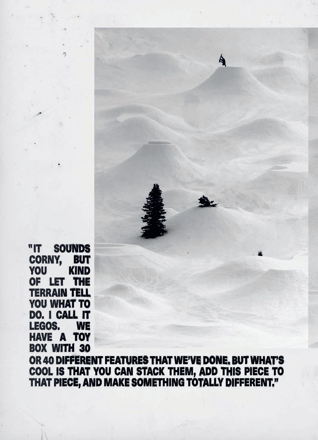 in certain ways. We shovel big piles of snow in our yards to have a ramp so we can have the speed to hit a at bar. That’s some kid’s whole winter. In my dad’s yard, I had a little mini hill and a fucking table on the ground and a little at bar, and that was my life for Winters. Going to Trollhaugen was awesome, but it’s also an hour away, and it costs a lot of money. I think us chasing this shit is like what we grew up on. We don’t know anything else. I mean, we love to ride the mountains too, but this is very close to home for us, and it feels accessible.