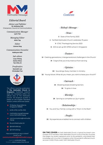 The official monthly publication of The Methodist Church in Singapore. Published material does not necessarily reflect the official view of The Methodist Church. All Scripture quoted is based on the English Standard Version unless otherwise stated.