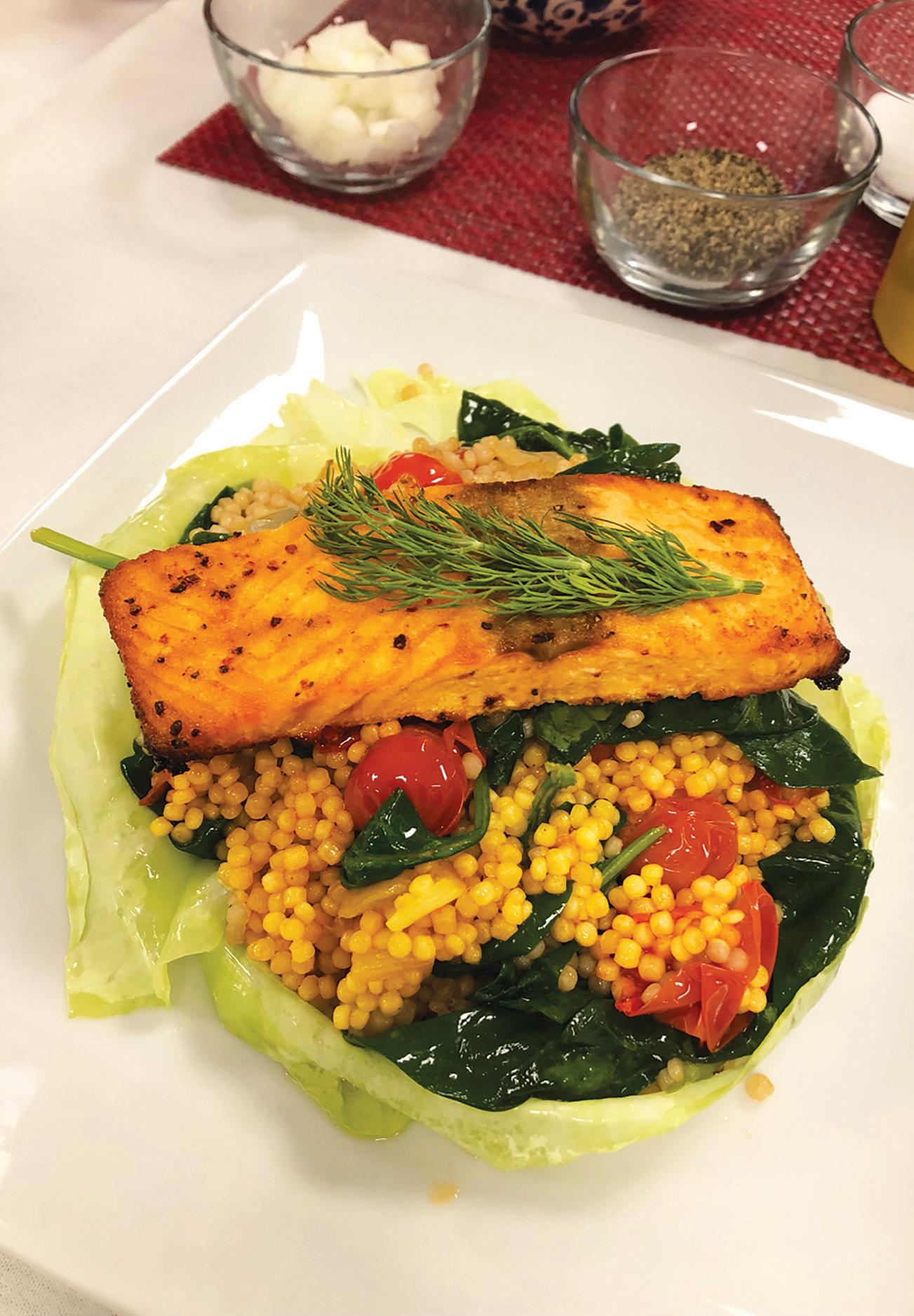 Season salmon with 1 tablespoon of olive oil and salt and pepper. In a separate pan or grill on medium heat, place salmon in pan and cook each side for 3 minutes or until internal temperature reaches 1450 F. Place the salmon on top of the couscous, squeeze a half of fresh lemon and garnish with chopped fresh dill. Enjoy!