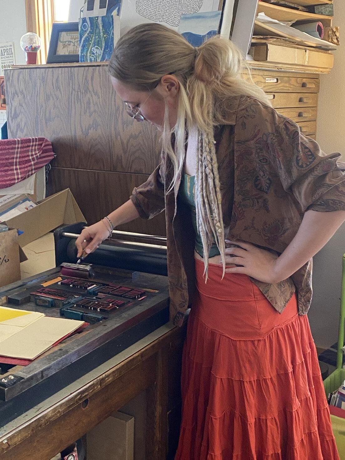 Laura Gunnip defies easy categorization. They float through Fireweed Print Shop—part artist’s studio, community sanctuary, and mystical portal—with a fairy-like flow, equally comfortable operating a letterpress or facilitating a transformation ritual. They describe themselves without hesitation as “neurodivergent intuitive witch, artist, teacher, parent, mentor, portal maker, community member.” Laura embodies multiplicity as both art form and survival.