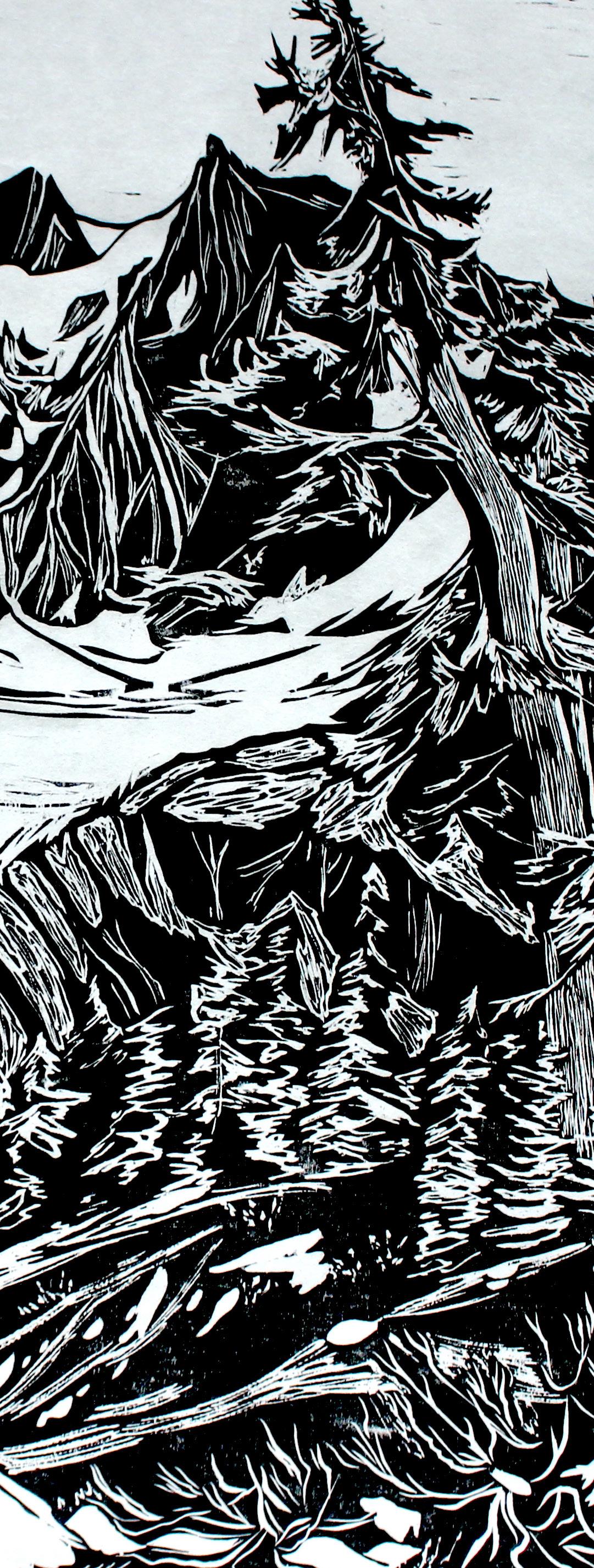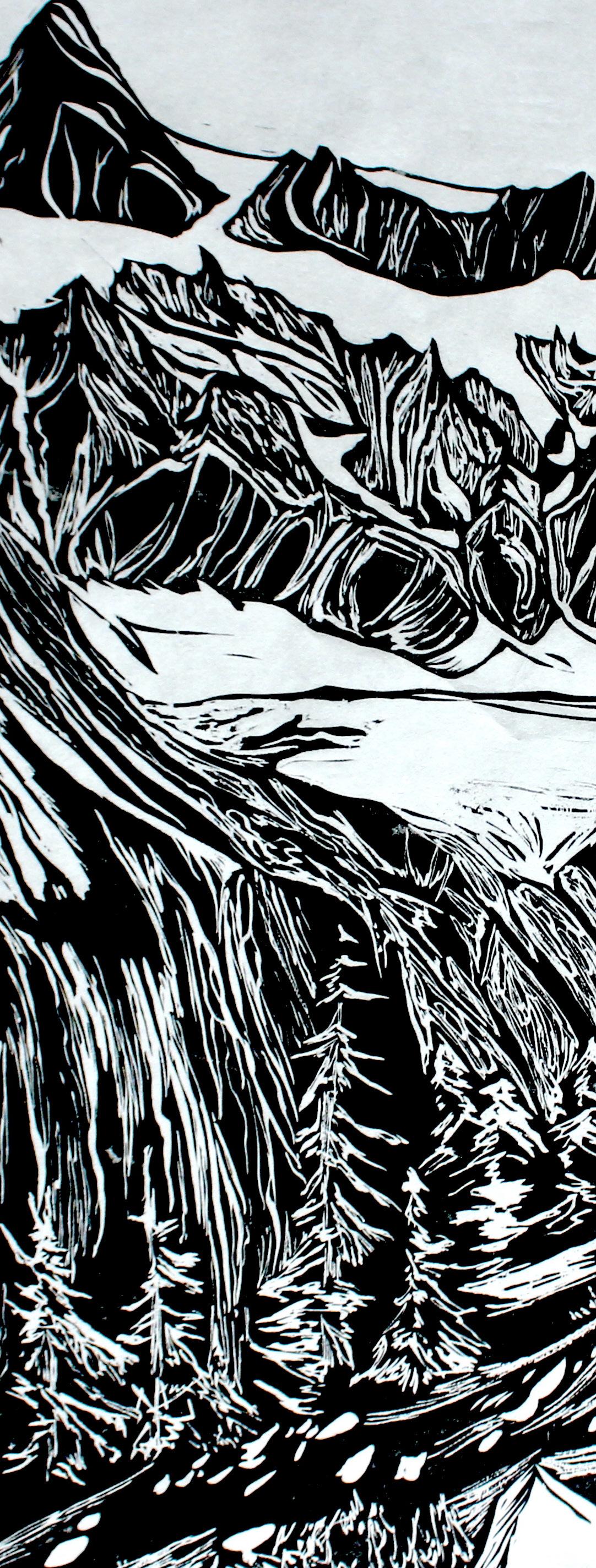 C: Yeah, finding inspiration in some wild place and transferring that to a print has a lot of experimentation or unpredictability! While I’m carving I usually make the marks intuitively, not checking reference photos too much, so I can channel the feelings and textures of being in the field, like how the ice was swooping. Working intuitively also helps me integrate the character of the wood I’m working with.