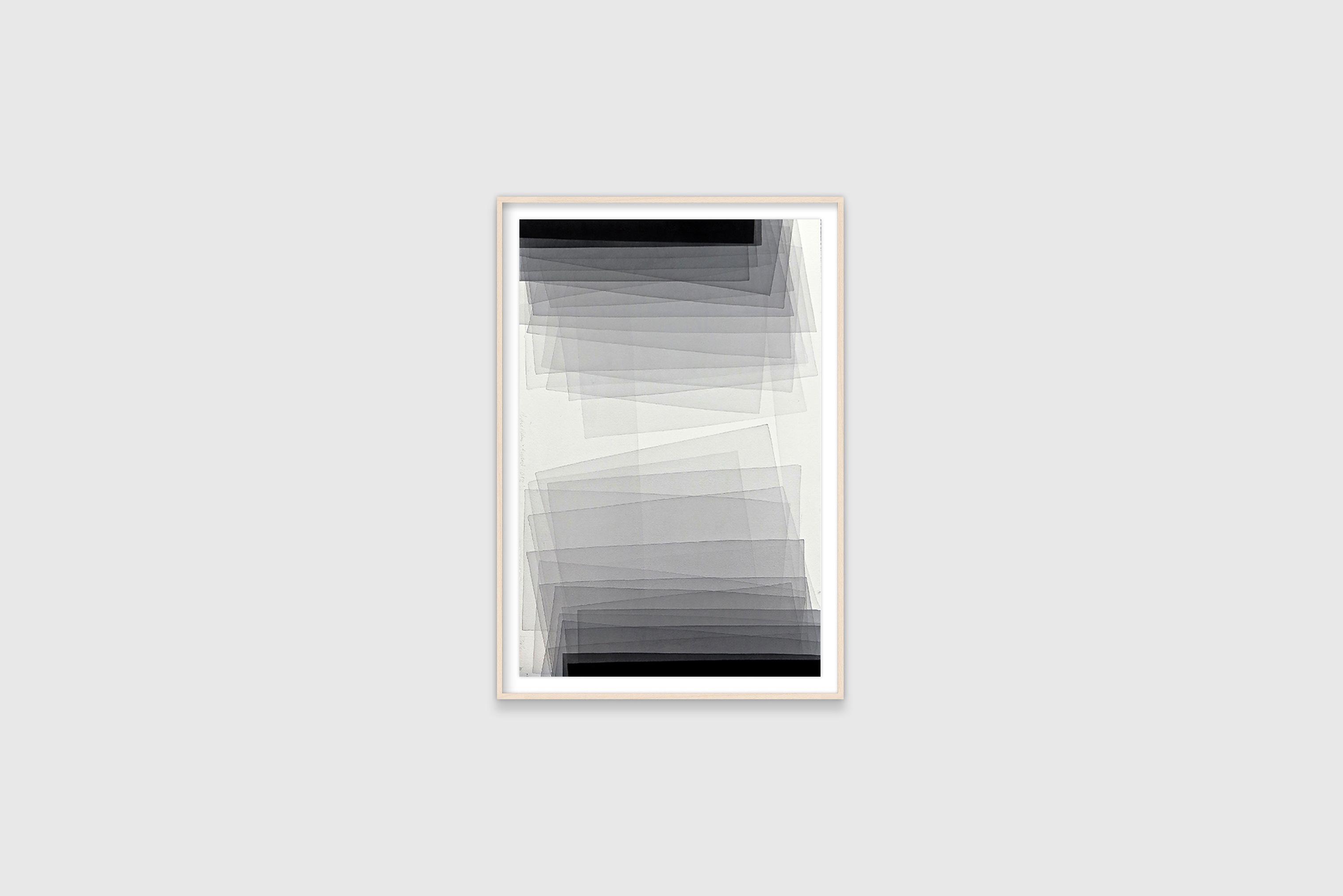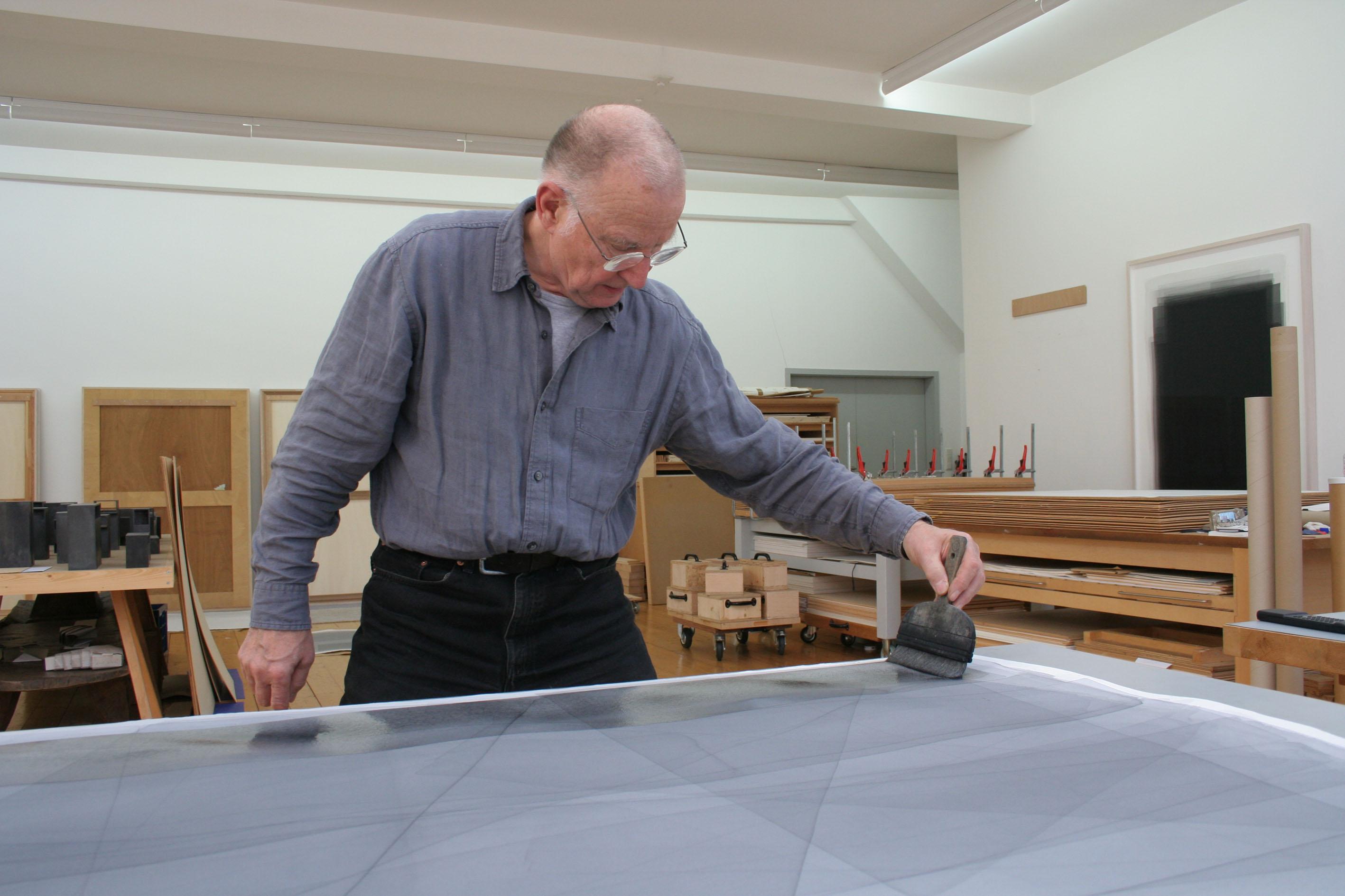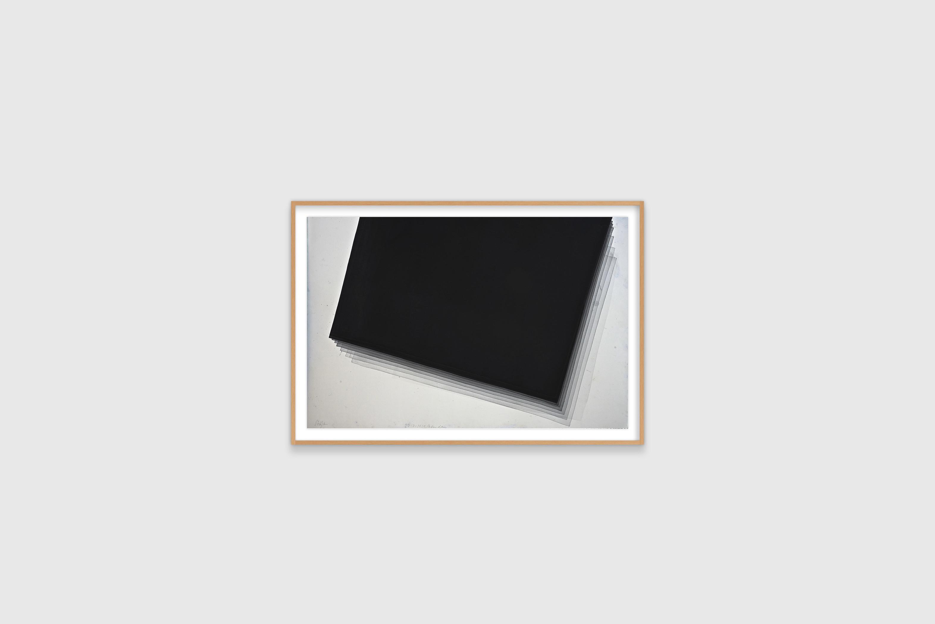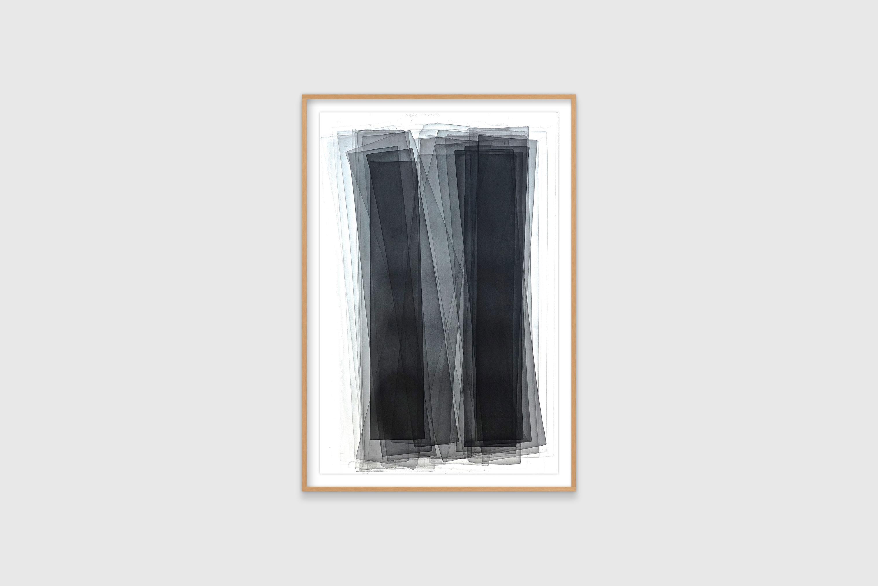 Joachim Bandau is an internationally celebrated sculptor and painter. Working with minimalist shapes and a restrained colour palette, Bandau applies his materials in unexpected and non-traditional ways. His precisely controlled and multi-layered watercolours take months, sometimes years, to complete as each layer must be carefully applied across a dry surface. Each of the resulting paintings contains its own movement and rhythm that depends on the direction and depth of the layering process. Music, specifcally baroque, is one of Bandau’s primary infuences for his black watercolour series.