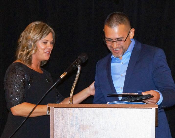 GOODWILL PRESIDENT & CEO TOBI MATHOUSER WEL COMING KEYNOTE SPEAKER ROGER GARCIA, DOUGLAS COUNTY COMMISSIONER, ON STAGE.