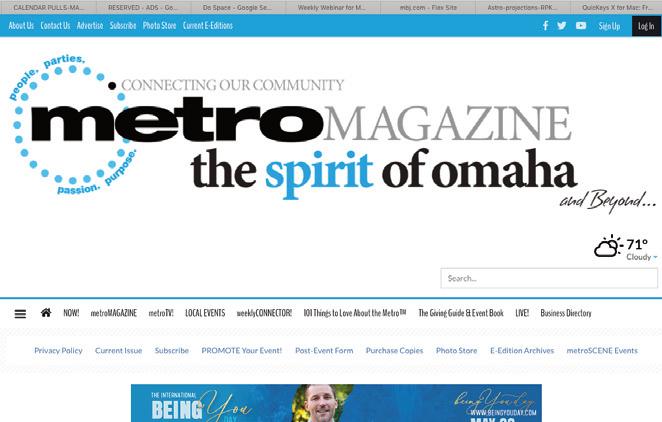 partner with us... 402.932.3522 • CONNECT@SpiritofOmaha.com ~ NATE DODGE PreSiDent, nP DODge COmPany MAKE THE CONNECTION! metromagazine is wholly owned and operated by the publisher and is not affiliated with any other publication, operating solely on subscription and advertising revenues and the good will of the agencies and charities we support; all of which are very important to the continuing growth and quality of this publication. thank you to all who support this endeavor. OFFICE/SALES 402.932.3522 | sales@SpiritofOmaha.com