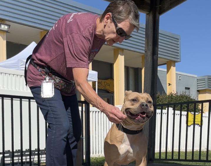 NHS VOLUNTEER PAM NEUMAN SHOWCASES ADOPT ABLE DOG CANE DURING THE ADOPTION DOG PARADE.