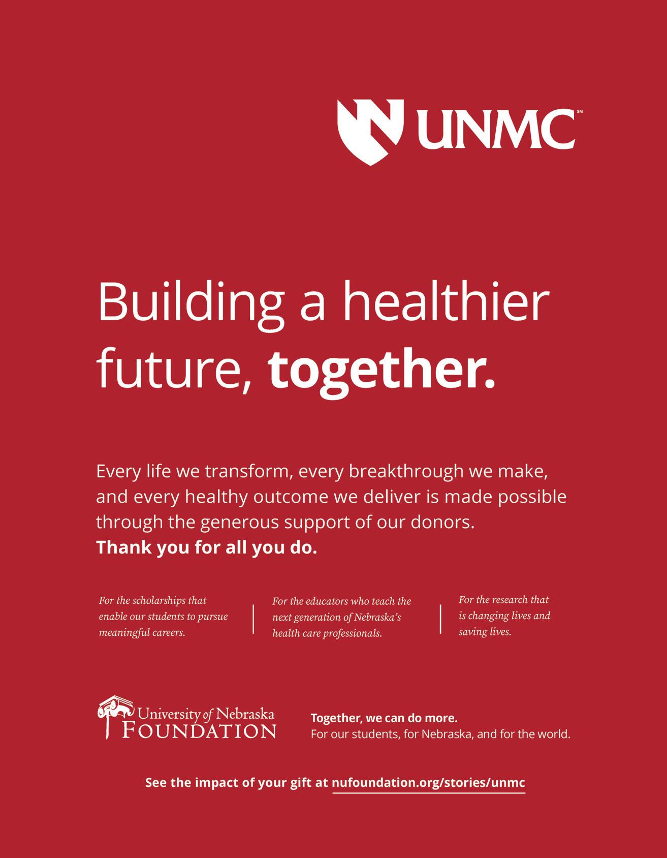 In this issue my team and I have appreciated the opportunity to work alongside UNMC team members to bring you an extraordinary understanding of UNMC’s impact on our commuhity. There are many people who were instrumental in making this issue happen and I THANK YOU! As I said earlier, I oftentimes have no words when I look at the amazing talent, the commitment, the innovation and the generosity of spirit that we have in our community.