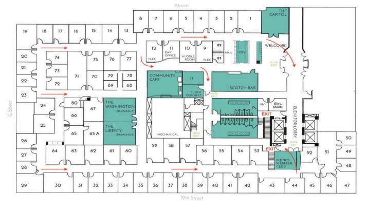 A MO team member will be in the reception/lobby area to direct all tenants and their guests to appropriate exits. Once tenants exit the stairwell a MO team member will do their best to direct tenants to our designated meeting area, directly across the street to the left of the metro elevator.