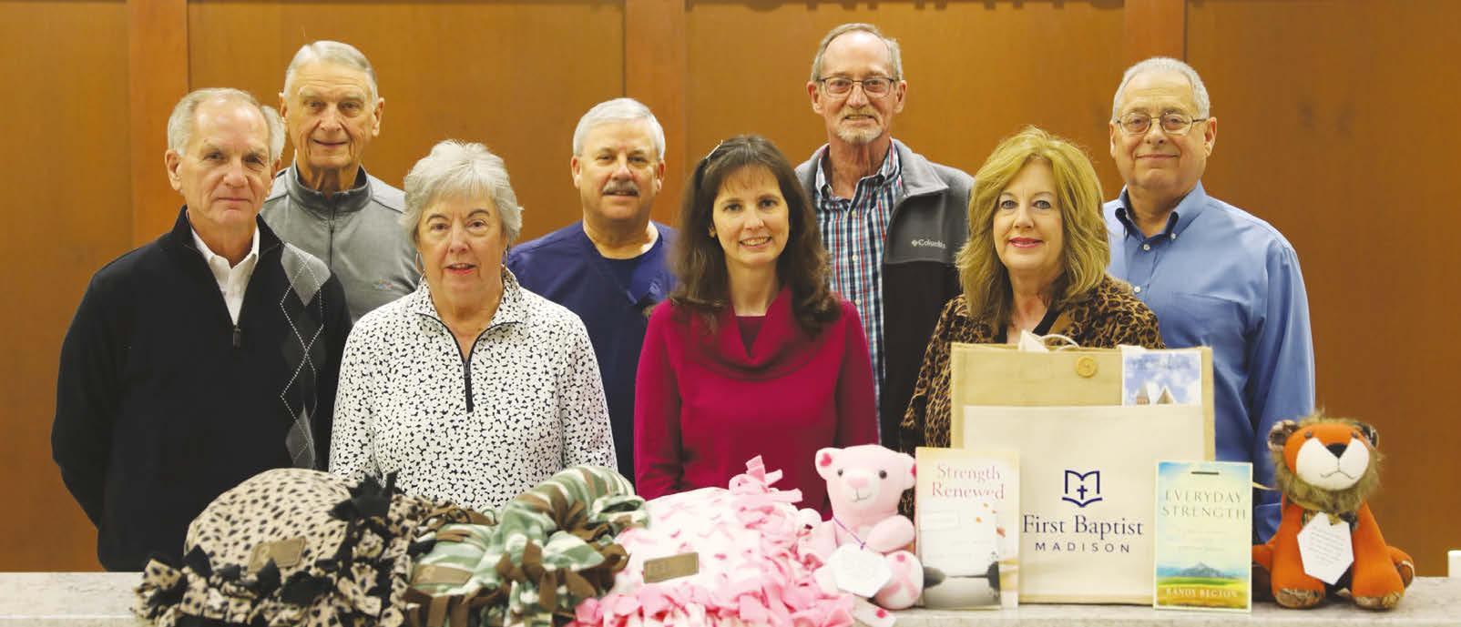 The First Baptist Madison Cancer Ministry leadership team poses with items that are placed in care packages for each cancer patient. Back, from left: Frank Montgomery, Bill Spence, Walter DeLoach and Steve Morris. Front, from left: Ministry founder Albert Archie, Freddie Montgomery, Jackie Fairly, and Kim Morris.