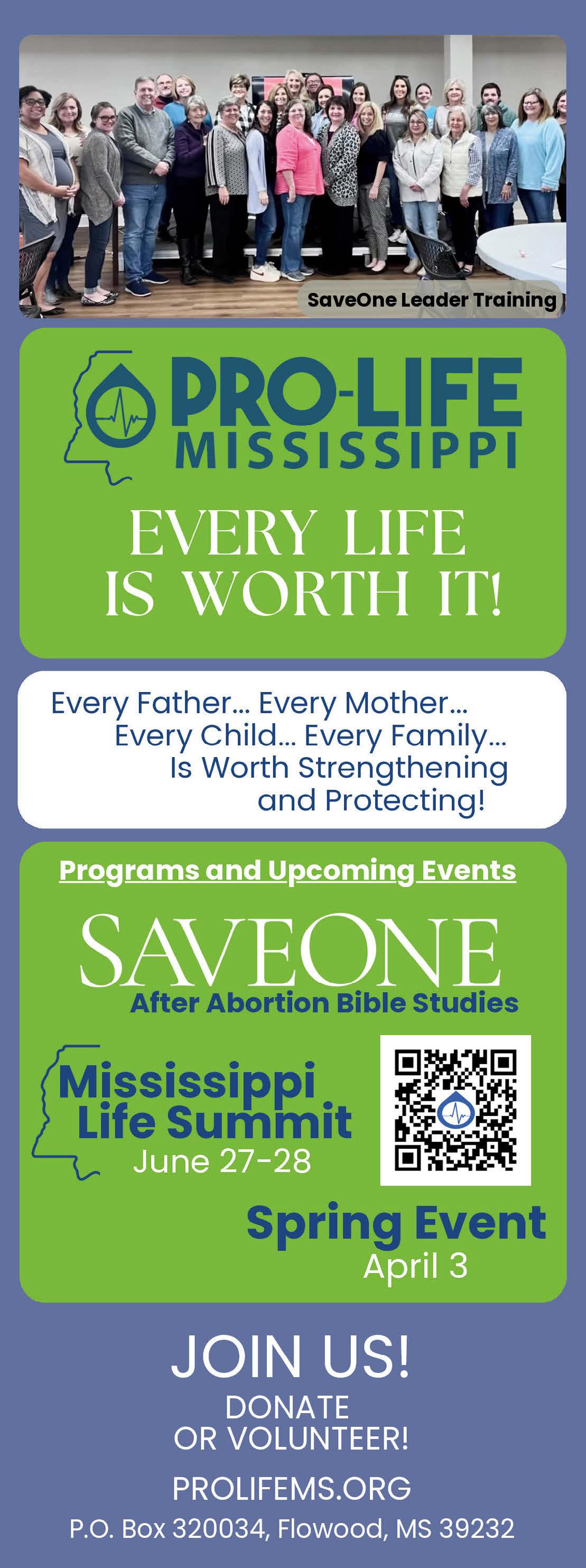 Mississippi Christian Living is committed to encouraging individuals in their daily lives by presenting the faith stories of others and by providing information that will point every person, at every stage of life, to a deeper, authentic, personal, and life-changing encounter with Jesus Christ. Views expressed in Mississippi Christian Living do not necessarily represent those of the publisher. Every effort has been made by the Mississippi Christian Living staff to ensure accuracy of the publication contents. However, we do not guarantee the accuracy of all information nor the absence of errors and omissions; hence, no responsibility can be or is assumed. All Rights Reserved. Copyright 2025 by MS Christian Living, Inc.