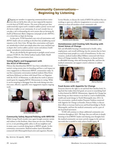 ngaging our members in supporting community-driven initiatives that are led by those who are most impacted by injustices is at the heart of TCMS’s mission. The events of the past year have underscored that urgent work is needed to address systemic racism and the harm it inflicts on our community. As we each consider how we can play a role in dismantling the racist systems that are harming the health of Minnesota’s Black, Indigenous and people of color (BIPOC), it is critical that we begin by listening. In that spirit, TCMS launched a new series of conversations with BIPOC leaders who are working on the front lines of addressing racial injustices in the Twin Cities. We hope these conversations will inspire our membership to think more deeply about these issues and find ways to deepen their work to address systemic racism and advance health equity. metrodoctors.com/communityconversations. We are also thrilled by the opportunity to spotlight several current and past TCMS Dr. Pete Dehnel medical student Public Health Advocacy Fellows as conversation hosts. Voting Rights and Engagement with the ACLU of Minnesota Policies that disenfranchise BIPOC have been embedded in our nation’s voting system since its founding and have a real impact on voter engagement in Minnesota’s BIPOC communities today. In our first community conversation medical students Mina Krenz and Jenna Robinson sat down with Ismael Dore, an Organizer with the ACLU of Minnesota, to talk about his work to advance racial equity by engaging BIPOC Minnesotans in voting. While it can be tempting to disengage from this work during non-election years, effective, equitable voter engagement requires ongoing work.