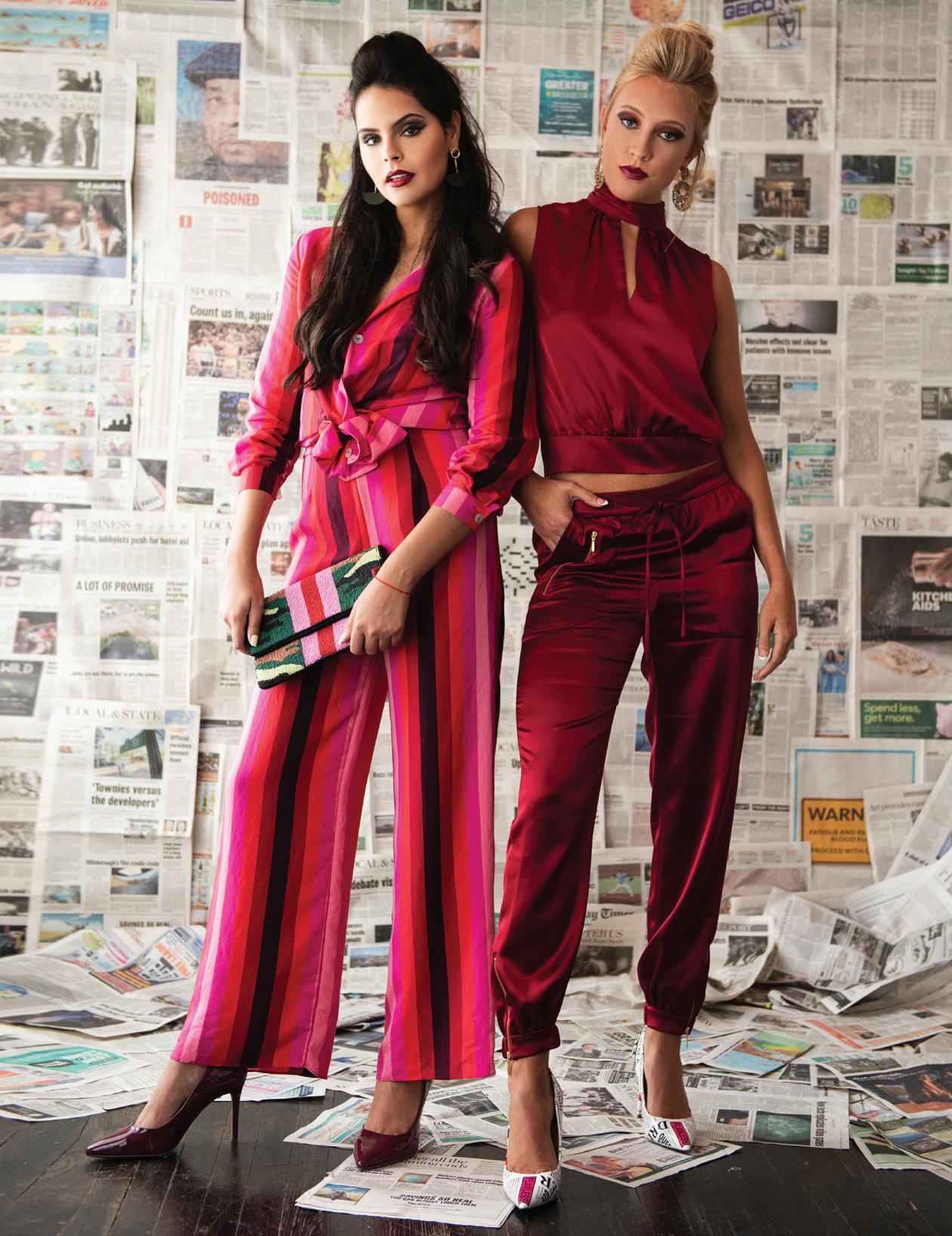 RACHEL: Top - Milly Rozanna Satin Top in Wine - $265; Bottom - Milly Rylan Hammered Satin Joggers in Wine - $325 - Jackie Z Style Co.; Earrings- Natasha gold/black earring - $28; Shoes- Steve Madden Vala Newspaper Print Stiletto Pumps - $92 – Dillard’s at International Plaza.